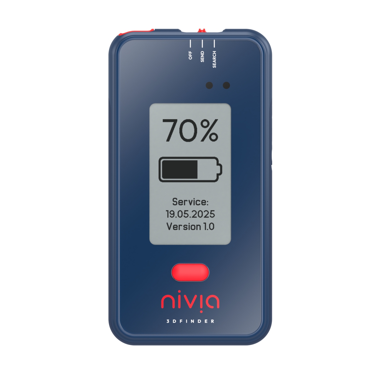 - Device control. After pressing the safety button, you can easily control the device using the OFF/SEND/SEARCH switch.Mark button. By simply pressing the red button, you can use the marking function for multiple burials, perform group checks, or configure the 3D finder if you have not yet set it up via the nivia app.USB Port. With the USB C port, you can charge your phone quickly and easily, or even recharge it in an emergency if necessary to make an emergency call via our app. Of course, the 3D finder always has priority so that it has sufficient charge itself.Display. Our large-format, high-contrast display allows you to always have everything in view, regardless of the lighting conditions on site.Battery. The lithium-ion battery charges quickly and provides up to 300 hours of battery life.Durability. The 3D finder is designed to last. It is made of robust 2K technopolymers and equipped with one of the hardest display covers available.